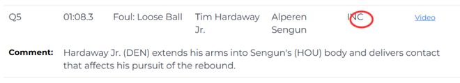 尽管掘金队当晚的总犯规数(28次)多于火箭队(25次),但联盟出具的该场比赛最后两分钟裁判报告显示,在加时赛最后两分钟内出现的三次错判,最终均对掘金队有利。